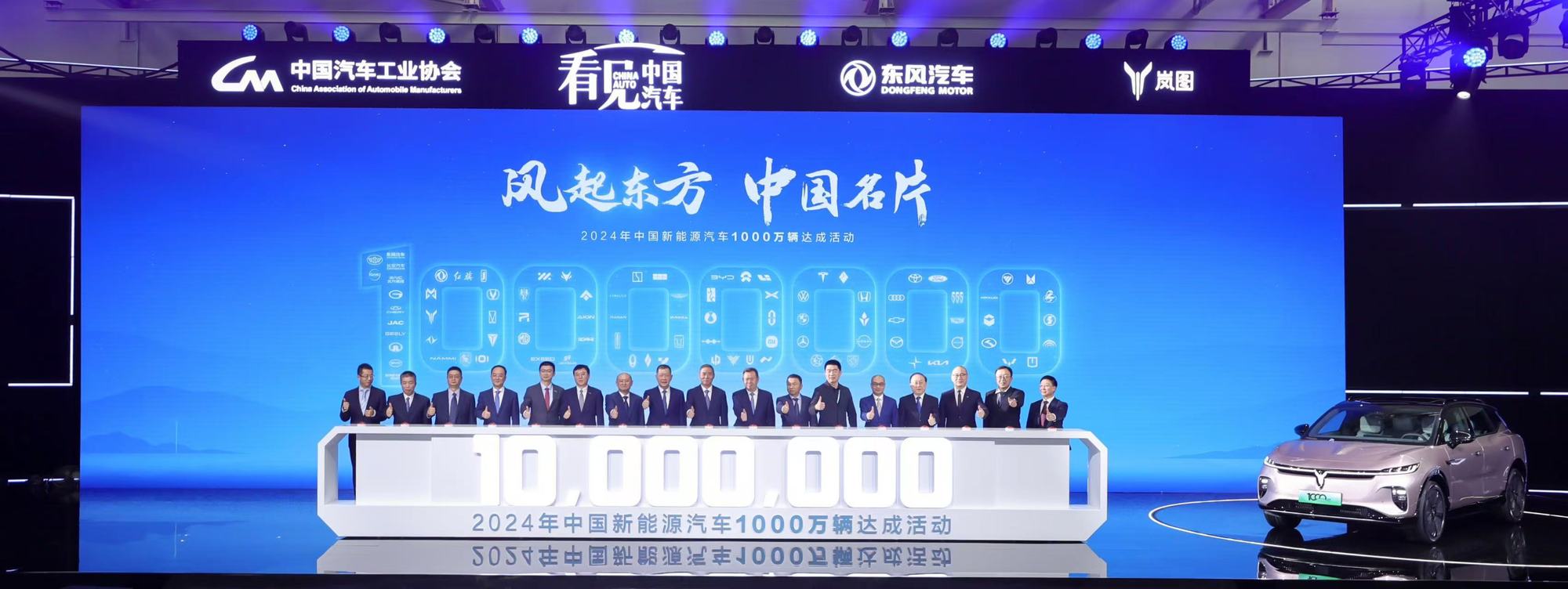 11月14日,在中華人民共和國(guó)工業(yè)和信息化部指導(dǎo)下,由中國(guó)汽車工業(yè)協(xié)會(huì)主辦,東風(fēng)汽車集團(tuán)有限公司(以下簡(jiǎn)稱東風(fēng)汽車)承辦的2024年中國(guó)新能源汽車1000萬(wàn)輛達(dá)成活動(dòng)在東風(fēng)嵐圖云峰工廠盛大舉行,嵐圖知音作為1000萬(wàn)輛中國(guó)新能源汽車下線車型。