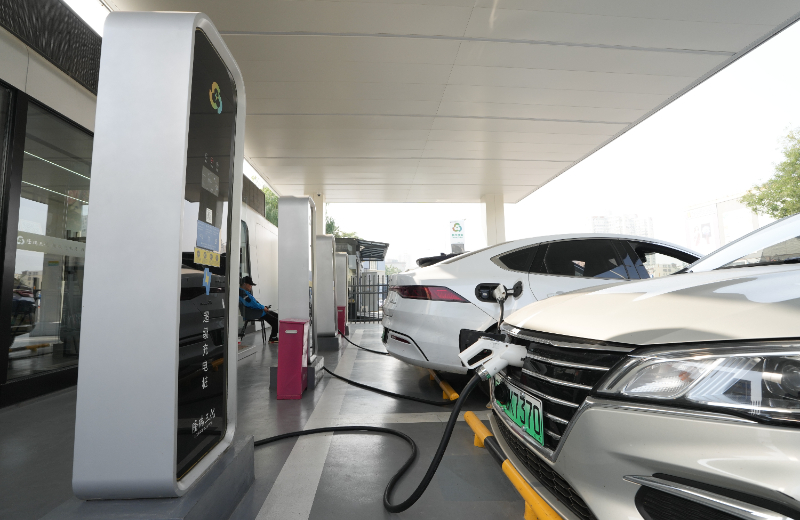 (資料照片)10月12日,在北京木樨園公交場站一座超級(jí)充電站內(nèi),新能源小客車在充電。新華社記者 鞠煥宗 攝