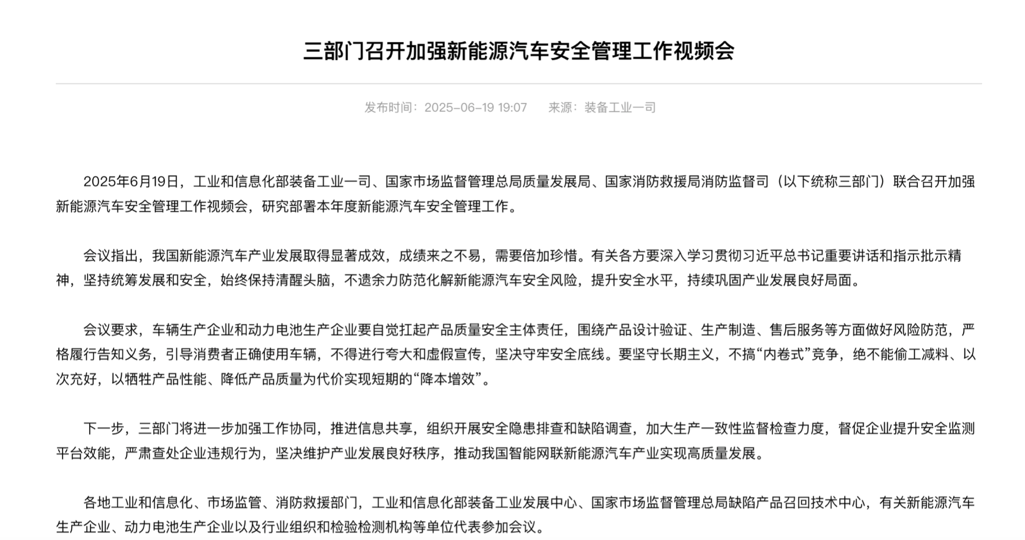 此前(6月9日),工信部已啟動道路機動車輛生產企業(yè)及產品生產一致性監(jiān)督檢查工作,此次三部門聯合行動進一步加碼新能源生產安全與質量管理。