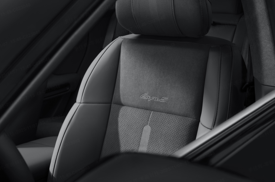 內飾配色提供速域紫、馳影灰、競速灰三種選擇,速域紫夜色霓虹與尾焰的顏色,極具時尚與運動感;馳影灰靈感源于賽道柏油的中性灰調,理性而不平庸;競速灰質感運動、出眾,采用5.54㎡仿麂皮超纖絨與Nappa全粒面真皮拼接,座椅上“延伸賽道”紋理與“Lafa5”專屬字標燙印,在細節(jié)處彰顯豪華運動質感。