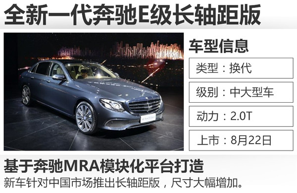 全新一代奔馳E級(jí)長(zhǎng)軸距于上個(gè)月在北京奔馳亦莊工廠正式下線,新車(chē)針對(duì)中國(guó)市場(chǎng)的需求進(jìn)行了全面優(yōu)化,從外觀、內(nèi)飾到車(chē)身尺寸都有明顯提升。網(wǎng)通社從梅賽德斯-奔馳官方了解到,全新一代奔馳E級(jí)長(zhǎng)軸距版將于8月22日在北京正式上市。新車(chē)采用不同調(diào)校的2.0T發(fā)動(dòng)機(jī),并首次搭載9速自動(dòng)變速箱。