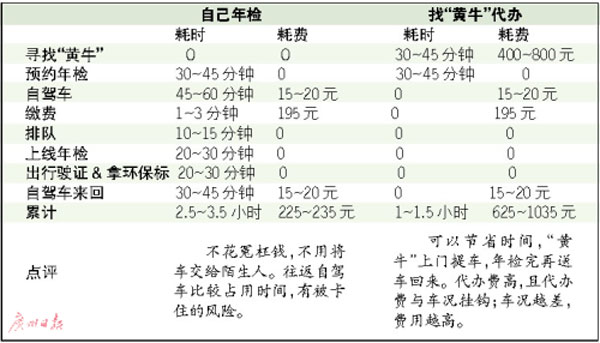 “老車”上線年檢,自己辦與找“黃?!贝k,各自需要占用多少時間和多少支出?給“黃牛”的冤枉錢,可不可以省下?