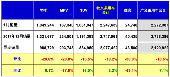 乘聯(lián)會數(shù)據(jù)顯示,1月SUV共銷售1031047輛,同比增長16.5%,環(huán)比下降13.5%。崔東樹認(rèn)為,1月SUV有如此增速,說明其處于良好的發(fā)展?fàn)顟B(tài),這說明在去年12月到今年1月小排量購置稅政策變化的過程中,SUV所受影響較小。