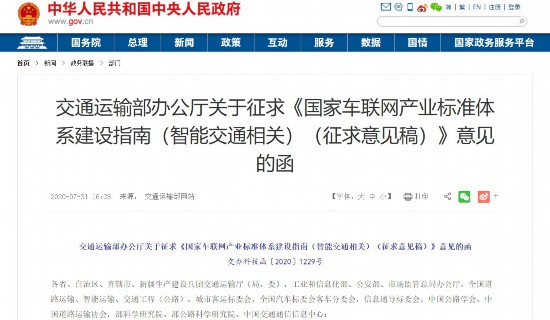 同日,交通運(yùn)輸部公開發(fā)函,廣泛征求對《國家車聯(lián)網(wǎng)產(chǎn)業(yè)標(biāo)準(zhǔn)體系建設(shè)指南(智能交通相關(guān))(征求意見稿)》(以下簡稱《征求意見稿》)的意見。其中,對進(jìn)一步明確標(biāo)準(zhǔn)制修訂重點(diǎn),以及形成統(tǒng)一、協(xié)調(diào)的國家車聯(lián)網(wǎng)產(chǎn)業(yè)標(biāo)準(zhǔn)體系架構(gòu)作出部署。