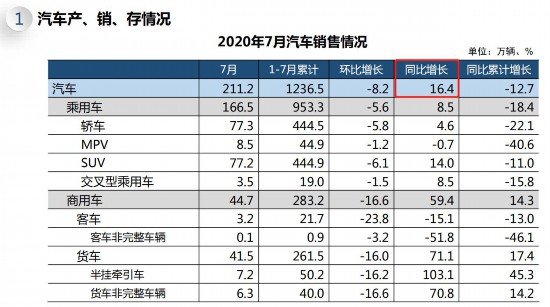從2020年累計銷量情況看,1-7月,汽車產(chǎn)銷量分別為1231.4萬輛和1236.5萬輛,同比下降11.8%和12.7%,降幅與1-6月相比,分別收窄5.0個百分點和4.2個百分點。