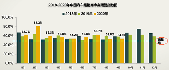 即便處于汽車市場的“金九”旺季,經(jīng)銷商的庫存壓力依然不小。昨日(10月13日),流通協(xié)會發(fā)布數(shù)據(jù)顯示,9月,國內(nèi)汽車經(jīng)銷商庫存預(yù)警指數(shù)為54.0%,較上月上升1.2個(gè)百分點(diǎn),較去年同期下降4.6個(gè)百分點(diǎn),庫存預(yù)警指數(shù)位于榮枯線之上。