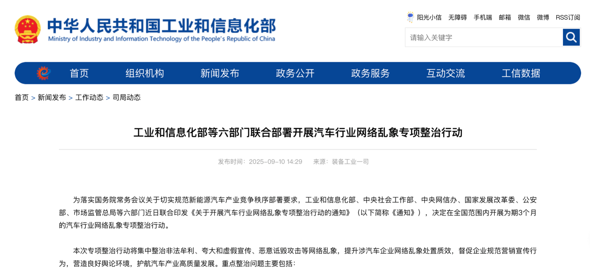 央廣網北京9月10日消息(記者董楠)9月10日,工業(yè)和信息化部(以下簡稱“工信部”)、中央社會工作部、中央網信辦、國家發(fā)展改革委、公安部、市場監(jiān)管總局等六部門聯合印發(fā)《關于開展汽車行業(yè)網絡亂象專項整治行動的通知》,決定在全國范圍內開展為期3個月的汽車行業(yè)網絡亂象專項整治行動。