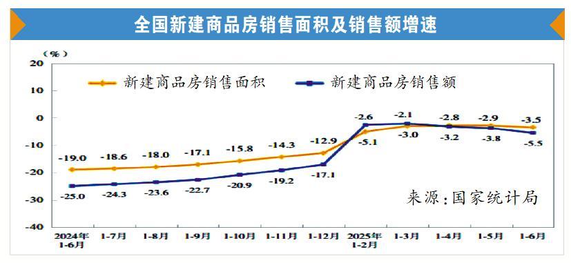 根據(jù)國(guó)家統(tǒng)計(jì)局發(fā)布的2025年上半年全國(guó)房地產(chǎn)市場(chǎng)基本情況,上半年,新建商品房銷售面積45851萬平方米,同比下降3.5%;其中住宅銷售面積下降3.7%。新建商品房銷售額44241億元,下降5.5%;其中住宅銷售額下降5.2%。6月末,商品房待售面積76948萬平方米,比5月末減少479萬平方米。其中,住宅待售面積減少443萬平方米。