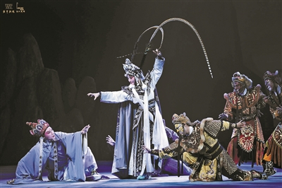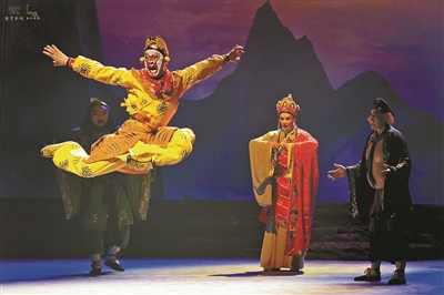 此外,該劇還利用舞臺(tái)技術(shù)突破了傳統(tǒng)戲曲的節(jié)奏,使之更為緊湊連貫。比如白骨精定下計(jì)謀要去偵探唐僧情況時(shí),舞臺(tái)光暗,一個(gè)發(fā)光小球飛升直達(dá)天幕,暗示白骨精元神飛出洞府,同時(shí)伴有類似影視音效作為烘托;而在唐僧狠心驅(qū)逐孫悟空時(shí),孫悟空向八戒沙僧交代完后,從上場(chǎng)門下場(chǎng),后場(chǎng)馬上就安排一個(gè)孫悟空替身吊威亞從上場(chǎng)口飛到下場(chǎng)口,過(guò)程連貫自然,這都是受到電影藝術(shù)啟發(fā)的創(chuàng)新。