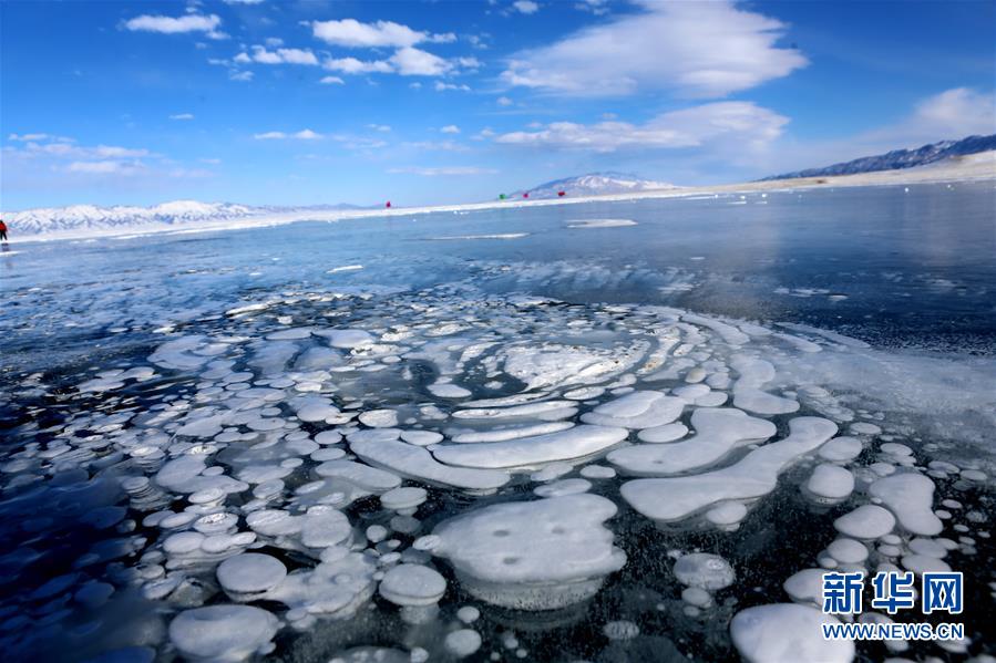 2月20日在新疆博爾塔拉蒙古自治州境內(nèi)的賽里木湖拍攝的湖面結(jié)冰后形成的冰花奇觀。進入2月份后,新疆海拔最高的湖泊賽里木湖湖面全部結(jié)冰,在湖邊的一些小泉眼處,不停泛出的氣泡在冷空氣作用下,迅速凝結(jié),形成了如冰柱、螺旋紋等形式多樣的冰花奇觀,令人嘆為觀止。新華社發(fā)(沈志君 攝)