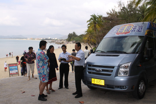 2011年初,三亞市特批???0多萬元,為旅游巡回法庭配置兩輛巡回審判車,車上設有國徽、法臺、原被告席、當事人座椅,還配備電腦、打印機,能即時制作裁判文書。從此,兩輛可以快立、快裁、快調(diào)、快結(jié)、快執(zhí)的巡回審判車開進了三亞各個景點,真正實現(xiàn)了哪里有旅游投訴和糾紛,巡回審判車就在第一時間趕到哪里。