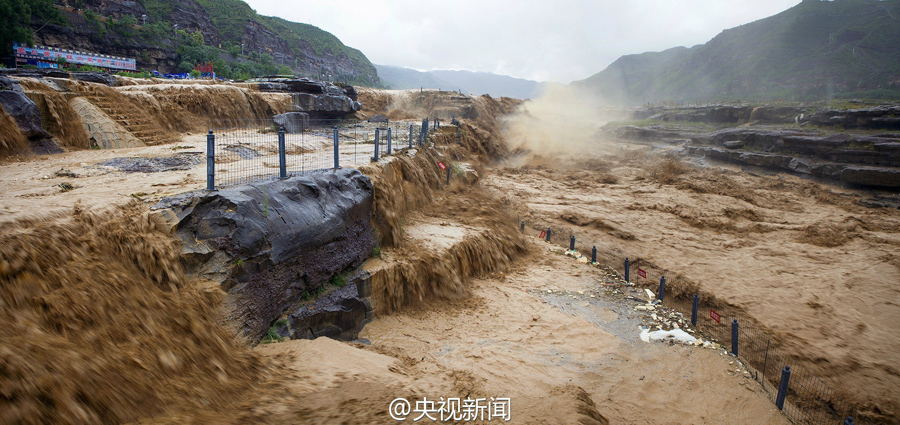 受上游強(qiáng)降雨和水庫放水影響,最近幾天,黃河壺口瀑布迎來伏汛,最大水流量達(dá)到每秒2600立方米左右,濁流滾滾奔騰而下,氣勢(shì)磅礴!(央視記者李志 文豪)