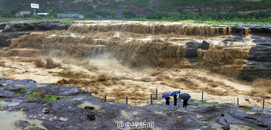 受上游強(qiáng)降雨和水庫放水影響,最近幾天,黃河壺口瀑布迎來伏汛,最大水流量達(dá)到每秒2600立方米左右,濁流滾滾奔騰而下,氣勢磅礴!(央視記者李志 文豪)