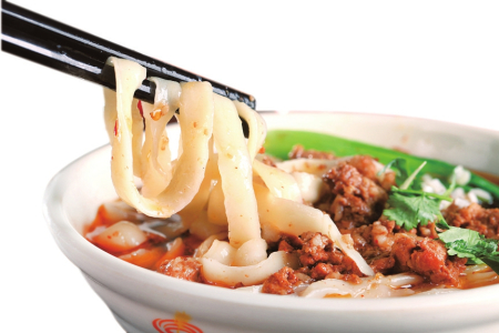 在開始削面之前,非常重要的步驟就是和面和醒面。和面的面和水需要按照一定的比例,同時對水溫也有一定的要求,冬天要用熱水,夏天要用涼水,春秋要用溫水。和好面之后緊接著就是醒面,需要用濕布蓋住面團醒20分鐘左右。如果說吃刀削面是飽了口福,那么看刀削面下鍋可稱之為飽了眼福。一只手托著放著面團的案板,另一只手拿著削面刀,削面刀又分為片刀和勾刀,削面時,出力要平,用力要均,削出的面條中間厚兩邊薄,一葉連著一葉,在空中劃出一道道弧形白線,落入鍋中的面條好似一條條銀魚,隨著熱水的翻滾不斷舞動。有順口溜贊曰:“一葉落鍋一葉飄,一葉離面又出刀,銀魚落水翻白浪,柳葉乘風(fēng)下樹梢?!?/p>