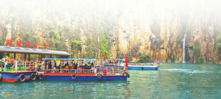 伴隨著他的講解,穿過800米的“時空隧道”,八泉峽山清水秀的核心地帶就躍然眼前了。3000米長的游船觀光水路時寬時窄,順流而下,游船上靜聽水流鳥鳴,看水中游魚穿梭而過,高峽平湖間,隨手一拍即是如畫美景,或碧波蕩漾,或山崖高聳,平靜的湖面與對峙的高山形成鮮明對比,不負(fù)“抬頭張家界,低頭九寨溝”之美名。
