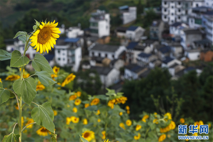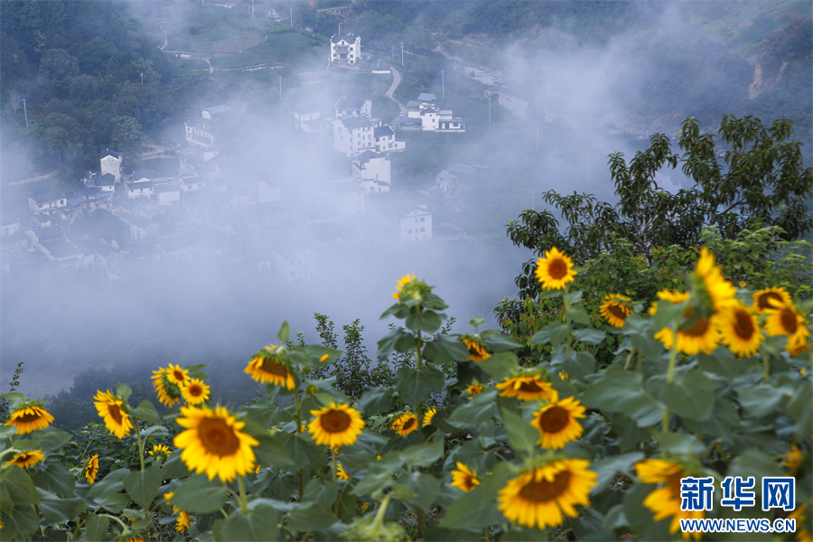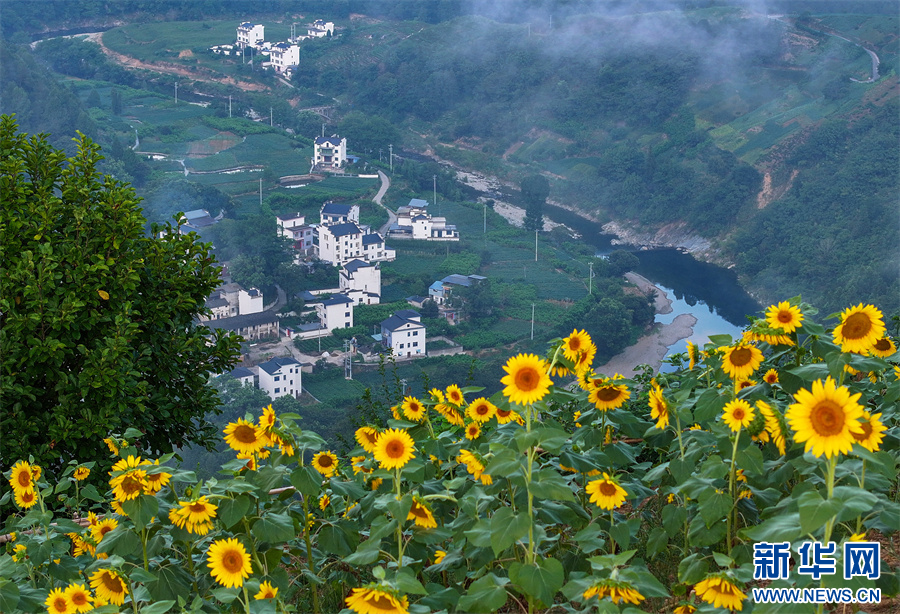 8月1日,在安徽省黃山市歙縣石潭古村拍攝的向日葵花海美景。