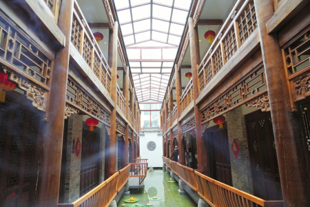 走進(jìn)觀山曉筑,別有洞天。建筑風(fēng)格古色古香,居中長長一池清泓,錦鯉、綠龜、卵石、荷花各自成趣。青磚墻雕既有北方莊重,水系綠植又有南方院落的靈致。房間裝修簡約古樸,窗窗都有風(fēng)光。