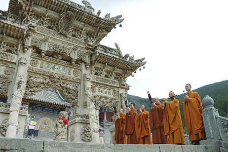 一次五臺山,五百年因緣。剛到龍泉寺108級臺階下,就聽到婉轉(zhuǎn)悠揚又直入人心的樂曲聲從高處傳來。走到龍泉寺三寶之一的照壁抬眼向高望去,越過青石臺階,第二寶石牌坊下,一隊僧人正在演繹國家級非物質(zhì)文化遺產(chǎn)五臺山佛樂。