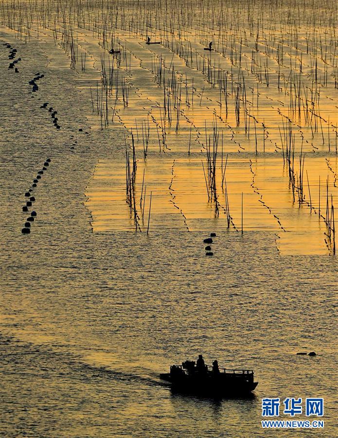 12月9日,夕陽西下,一艘漁船穿行在海上紫菜養(yǎng)殖架間。福建省寧德市的霞浦縣以美麗的淺海、灘涂聞名,豐富的旅游資源和人文資源一直是攝影師追逐的靈感所在。 新華社記者魏培全攝
