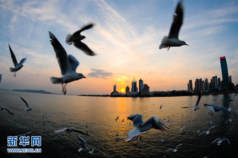 1月10日,水鳥在青島棧橋景區(qū)一帶飛翔。當日,山東省青島市天氣晴好,黃昏時分沿海一帶景色迷人。 新華社發(fā)(王海濱 攝)