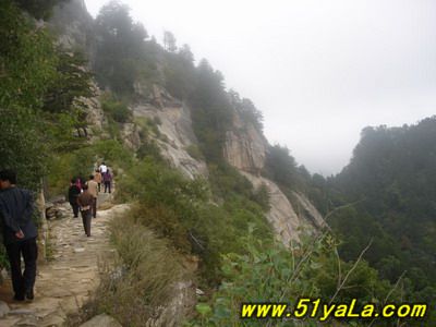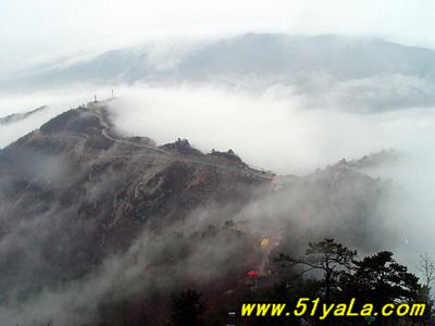 北武當(dāng)山主峰四周幾乎都是陡壁懸崖,只有一條人造“天梯”可攀。來(lái)到山腳下,過(guò)五里黃土、五里沙路,便是1400余級(jí)就山鑿筑的石階,凡險(xiǎn)峻之處,設(shè)有鐵索扶手。石階一線疊置,從下仰視,宛如“天梯”。游人攀登,每一步都可聽(tīng)到悠揚(yáng)頓挫的“石音”,形成獨(dú)特的“石樂(lè)”絕景。沿著石階,奇松異石、廟宇石刻,掩沒(méi)在蔥郁的山林植被之中,相間點(diǎn)綴,相映成趣。主要的山石景觀有:古猿望日、石豬受難、九龍出洞、石象守山、天壺傾露、石羊朝圣、石龜下蛋、石虎、石蛤蟆、龜蛇斗智等。最令人稱(chēng)奇的是“龜蛇斗智”奇觀,相傳神龜和青蛇不安心修道,互相格斗,經(jīng)過(guò)七七四十九天的麈戰(zhàn),神龜節(jié)節(jié)敗退,青蛇步步緊逼。其時(shí),恰逢真武大帝返宮,見(jiàn)狀,輕輕用手指一點(diǎn),龜蛇便動(dòng)彈不得,從此永久停留在這里,成千古一絕——“蛇石”虎視眈眈,“龜石”尾臨懸崖,萬(wàn)斤重石,峭立崖畔,用力一推或經(jīng)風(fēng)一吹,便搖搖欲墜,令人心懸,所以又稱(chēng)風(fēng)動(dòng)石,為我國(guó)罕見(jiàn)的景觀之一。主要的奇松景觀有:鴛鴦松、迎客松、托天松、母子松等。最使人嘆為觀止的是“擎天探海松”,其松立于石階半道,樹(shù)身技分兩杈,一直刺青天,一枝瞰群峰。近金頂?shù)悄咸扉T(mén)石階,旁邊陡崖上刻有“喬松”二字,據(jù)載為清代道光年間永寧州牧王繼賢手跡。現(xiàn)存喬松樹(shù)樁直徑近1米,可以想見(jiàn)其昔日雄姿。主要的懸崖峭壁有:千仞壁、舍身崖、鷹嘴崖等。還有呈垂直分布的植被,其色彩和花期隨季節(jié)變化,給北武當(dāng)山披上了“春粉、夏艷、秋紅、冬白”的盛裝。登臨武當(dāng)之巔,一覽眾山,但見(jiàn)遠(yuǎn)山蒼茫,近日含黛,松風(fēng)撲面,白云飄逸;只聞松濤陣陣,山泉潺潺,鳥(niǎo)語(yǔ)唧唧,似琴弦輕撥;夏秋之季,如晴空萬(wàn)里,金頂之下,叢林景觀相間,似七彩織錦;白云遠(yuǎn)處,群山連綿,猶如萬(wàn)龍翻騰,極為壯觀。