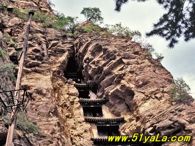 北洞是主體建筑部分。中區(qū)有大殿三間,座北向南。原為道教三清塑像,后被佛教改成三世佛。左右耳殿,另有東西配殿各三間,南閣一間。東側(cè)迎面山壁上,自然形成龐大的三角形石縫,內(nèi)有天然石洞,景觀奇特。石縫上端,外建五層樓閣。依崖開鑿卯洞,梁架結(jié)構(gòu)與崖石交接構(gòu)筑,建造精巧。閣內(nèi)設(shè)有鐵索,扶鐵索可攀援而上。在閣的東邊又有一洞,內(nèi)建殿三間,名九仙女閣,塑九仙女像。箭閣外塑趙杲泥像,頭頂距石崖僅二指半,故舊稱“趙杲觀,離天二指半”。再往南,就是趙杲觀最險峻的景觀了。峭峰高處,半山腰中,山洞前面,建樓三間。一眼望去,高閣懸空,上峭崖,下絕壁,左右山石如刀削。上下左右根本無路可通。山洞中垂下一條長約20米的鐵索,成了進(jìn)洞的唯一途徑。只有勇敢的虔誠者或探險者,方可垂直攀索而登,一般人只能望樓興嘆,故鐵索被譽(yù)為“仙閣云梯”。三層樓建筑后依山洞,前為磚木結(jié)構(gòu)。上層內(nèi)塑太上老君、無始天尊、通天教主。中層內(nèi)塑關(guān)圣帝君。下層供修持者居住。當(dāng)時修筑情景,真令人難以想像。北洞群落,地形險要,峰巒競秀,古木參天,峭峻幽邃,設(shè)計大膽,造型奇特。人夸“雁北懸空寺,不及代州趙杲現(xiàn)”說的并不過分。