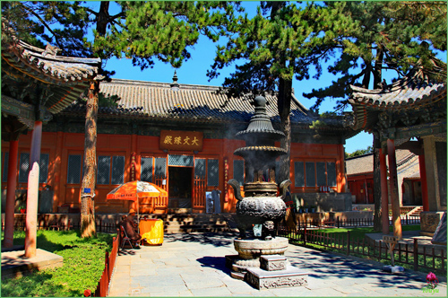 顯通寺的大雄寶殿為舉行佛事活動(dòng)主要場所,是顯通寺的第三重大殿,殿內(nèi)供著三尊佛像:中是釋迦牟尼佛,西是阿彌陀佛,東是藥師佛;兩旁有十八羅漢像背后有觀音、文殊、普賢三尊菩薩像。觀音殿殿內(nèi),中間供著觀音菩薩像,左右供著文殊和普賢菩薩像。大文殊殿,是顯通寺的第二重大殿。大文殊殿內(nèi),供著七尊文殊菩薩像:正中的為大智文殊;前面的五位,從左至右,依次為西臺(tái)獅子文殊,南臺(tái)智慧文殊,中臺(tái)孺者文殊,北臺(tái)無垢文殊,東臺(tái)聰明文殊;大智文殊后面是甘露文殊。文殊像前有護(hù)法神韋馱像,兩側(cè)有十八羅漢像。
