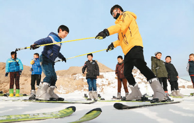 圖為在甘肅省山丹縣佛山滑雪場,近百名中小學生正在滑雪教練的指導下體驗冰雪運動樂趣。張 淵  攝(人民視覺)