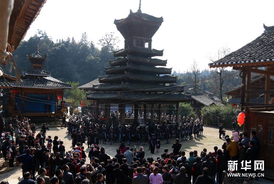 2月17日,貴州省黔東南苗族侗族自治州黎平縣巖洞鎮(zhèn)述洞村開展一年一度的“鼓樓之宗”活動。侗族老人在當?shù)刈罟爬系墓臉恰冀ㄓ诿鞔莫氈臉侵v述侗族遷徙歷程,告誡大家要敬老尊賢、和睦相處、團結友善,侗族青年男女身著節(jié)日盛裝圍著鼓樓一邊踩歌堂,一邊唱遷徙古歌,之后在鼓樓旁進行“侗族大歌”對唱,感懷族群遷徙的歷史,傳承傳統(tǒng)文化。新華社發(fā)(楊代富 攝)