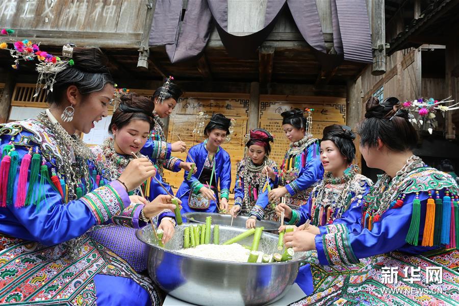 5月3日,貴州省首批魅力侗寨——榕江縣烏公侗寨歡度傳統的竹米節(jié),重溫侗民遠古農耕風情。竹米節(jié)也叫吃竹筍飯,在每年谷雨至立夏期間竹筍生長的時候,侗族群眾采摘斑竹筍,把糯米灌進筍筒煮熟食用。這樣既能保持米飯的原味,又有竹筍的清香,并且還方便攜帶至坡上田間地頭食用。久而久之,侗族人每到春夏之交的農耕時節(jié)都會過竹米節(jié),殺豬宰羊祭祀侗族祖先,唱歌跳舞祈求五谷豐登。新華社發(fā)(楊成利 攝)
