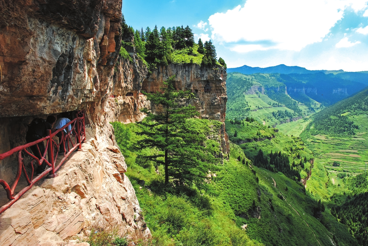 懸崖棧道位于寧武縣清真山,屬額狀丹霞巖地貌,由唐代貞元年間始建的佛教懸空古剎群與棧道共同構成。棧道原長42華里,現(xiàn)有修復段5華里及羅漢殿、毗盧殿等建筑群,其中羅漢殿“回聲階”屬全國五大回聲建筑之一。懸崖棧道的攀爬較為艱險,需要兩個小時,途中要攀登懸崖、臺階,還要穿越僅可容一人通過的山間隧道。