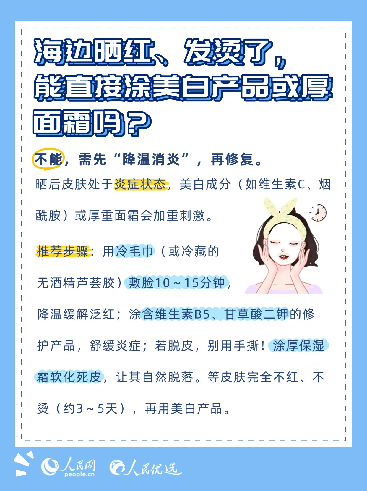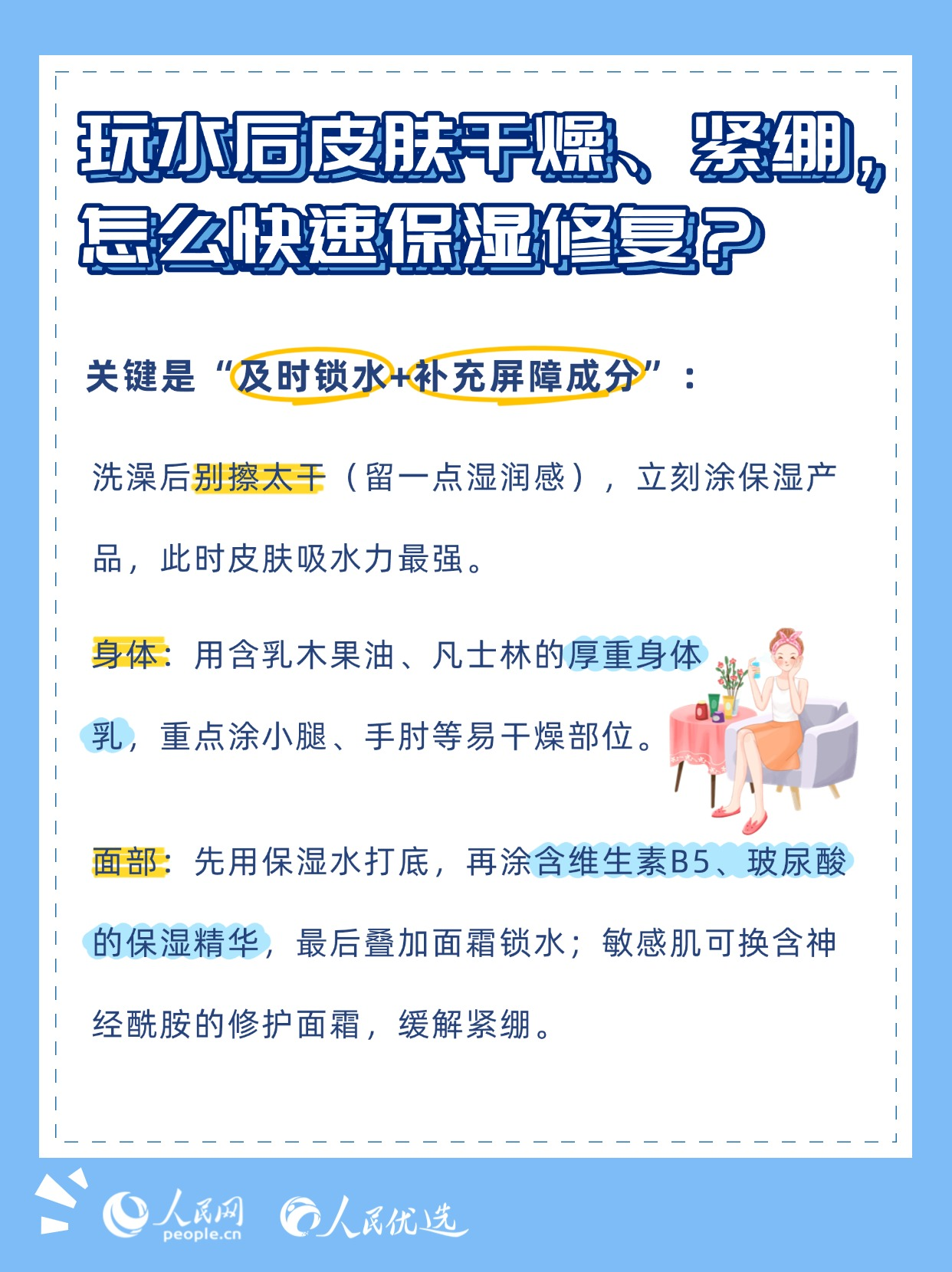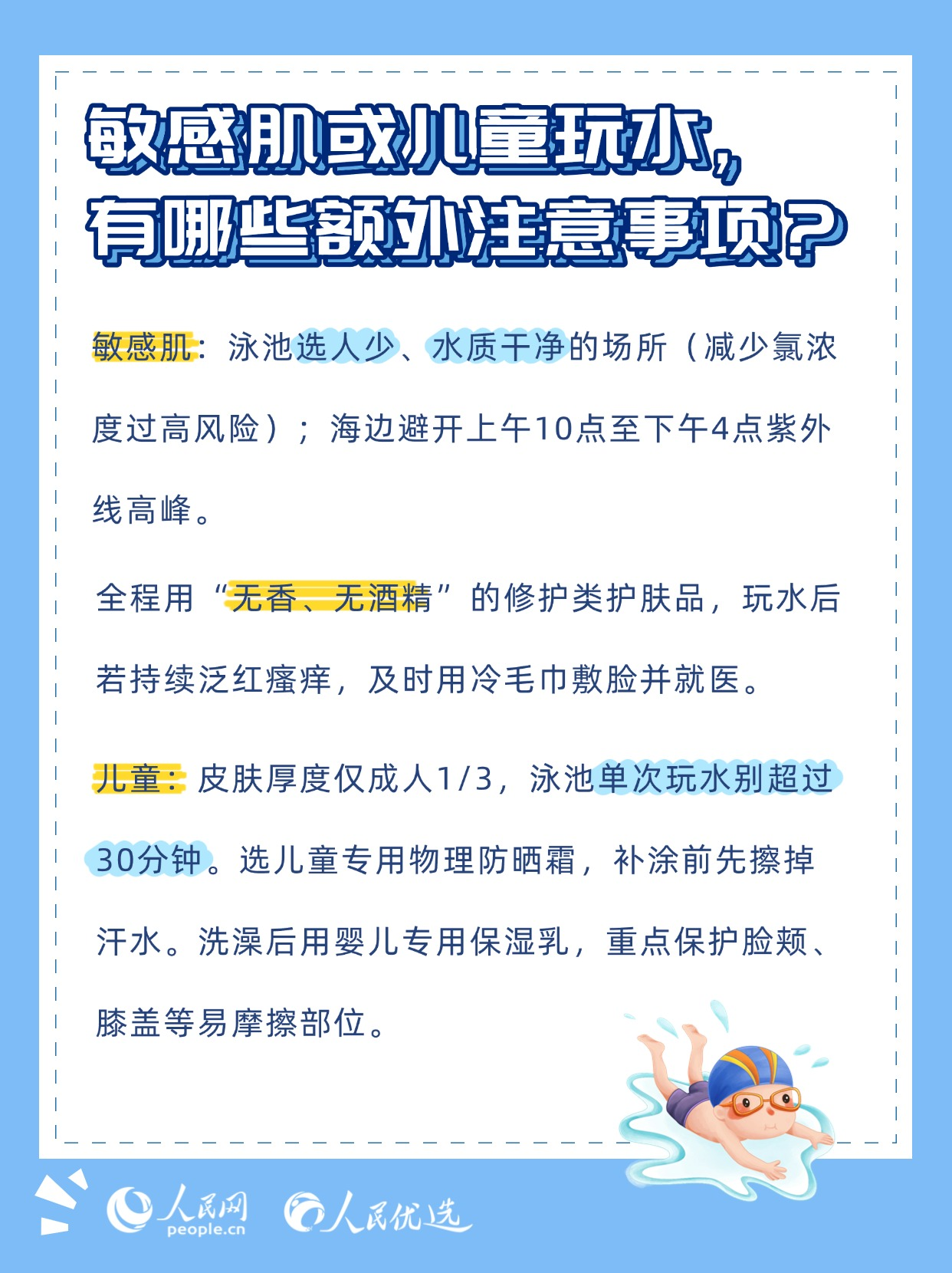 夏日炎炎,無論是泳池里的清涼暢游,還是海邊的逐浪嬉戲,都是驅(qū)散暑氣的不錯選擇。但玩水的快樂背后,卻藏著不少傷害皮膚的“陷阱”——泳池的消毒劑、海邊的強紫外線、海水中的高鹽分,稍有不慎就可能引發(fā)皮膚干燥、泛紅、曬黑、長斑甚至?xí)駛?。本期《人民?yōu)選來了》教你掌握科學(xué)的護膚方法,讓你在享受玩水樂趣的同時,保持健康的肌膚狀態(tài)。