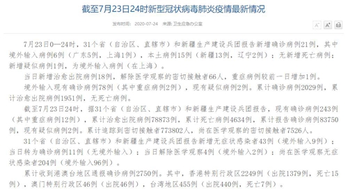 情況表示,截至7月23日24時,據(jù)31個?。ㄗ灾螀^(qū)、直轄市)和新疆生產(chǎn)建設兵團報告,現(xiàn)有確診病例243例(其中重癥病例12例),累計治愈出院病例78873例,累計死亡病例4634例,累計報告確診病例83750例,現(xiàn)有疑似病例2例。累計追蹤到密切接觸者773802人,尚在醫(yī)學觀察的密切接觸者7526人。