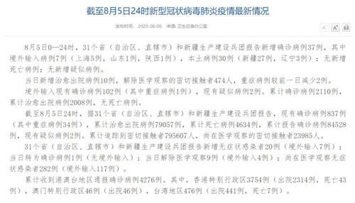 人民網(wǎng)北京8月6日電(董童)國家衛(wèi)生健康委于今日在官網(wǎng)發(fā)布的《截至8月5日24時(shí)新型冠狀病毒肺炎疫情最新情況》(以下簡稱“情況”)提出,8月5日0—24時(shí),31個(gè)?。ㄗ灾螀^(qū)、直轄市)和新疆生產(chǎn)建設(shè)兵團(tuán)報(bào)告新增確診病例37例,其中境外輸入病例7例(上海5例,山東1例,陜西1例),本土病例30例(新疆27例,遼寧3例);無新增死亡病例;無新增疑似病例。當(dāng)日新增治愈出院病例10例,解除醫(yī)學(xué)觀察的密切接觸者474人,重癥病例較前一日減少2例。