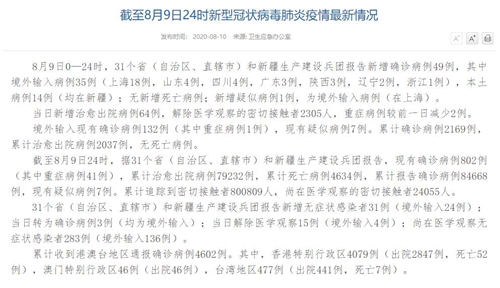 國家衛(wèi)健委:8月9日新增確診病例49例 其中本土病例14例均在新疆