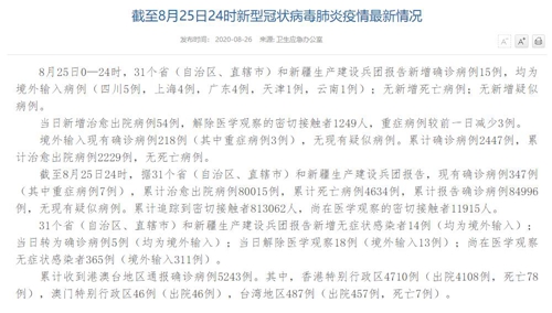 情況顯示,截至8月25日24時,據(jù)31個?。ㄗ灾螀^(qū)、直轄市)和新疆生產(chǎn)建設兵團報告,現(xiàn)有確診病例347例(其中重癥病例7例),累計治愈出院病例80015例,累計死亡病例4634例,累計報告確診病例84996例,無現(xiàn)有疑似病例。累計追蹤到密切接觸者813062人,尚在醫(yī)學觀察的密切接觸者11915人。