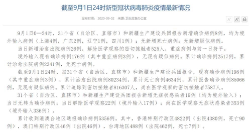 截至9月1日24時,據(jù)31個?。ㄗ灾螀^(qū)、直轄市)和新疆生產(chǎn)建設兵團報告,現(xiàn)有確診病例198例(其中重癥病例3例),累計治愈出院病例80234例,累計死亡病例4634例,累計報告確診病例85066例,無現(xiàn)有疑似病例。累計追蹤到密切接觸者816307人,尚在醫(yī)學觀察的密切接觸者7587人。
