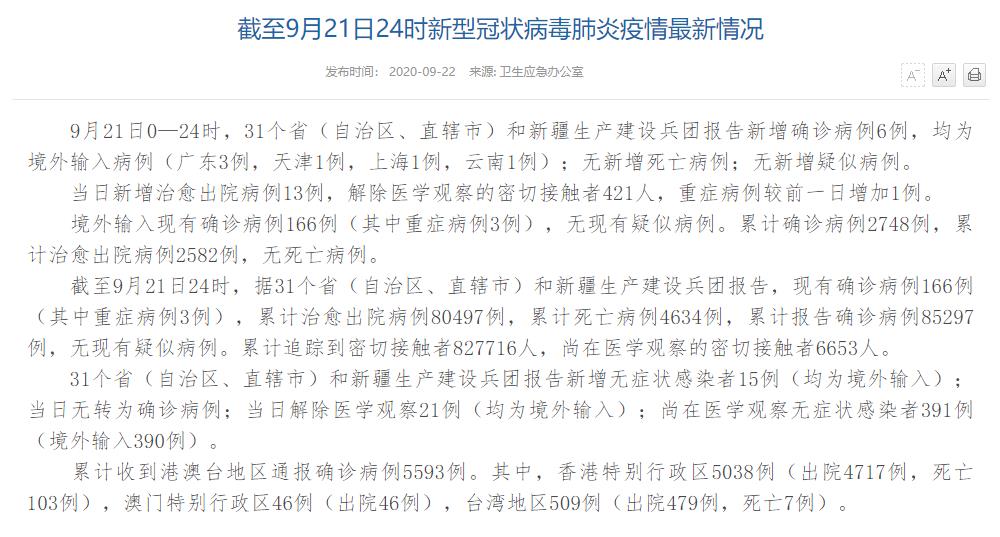 情況顯示,截至9月21日24時,據(jù)31個?。ㄗ灾螀^(qū)、直轄市)和新疆生產建設兵團報告,現(xiàn)有確診病例166例(其中重癥病例3例),累計治愈出院病例80497例,累計死亡病例4634例,累計報告確診病例85297例,無現(xiàn)有疑似病例。累計追蹤到密切接觸者827716人,尚在醫(yī)學觀察的密切接觸者6653人。