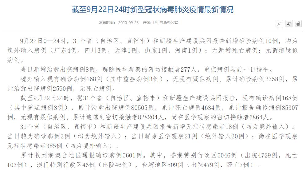 | 國家衛(wèi)健委:9月22日新增確診病例10例 均為境外輸入病例 |