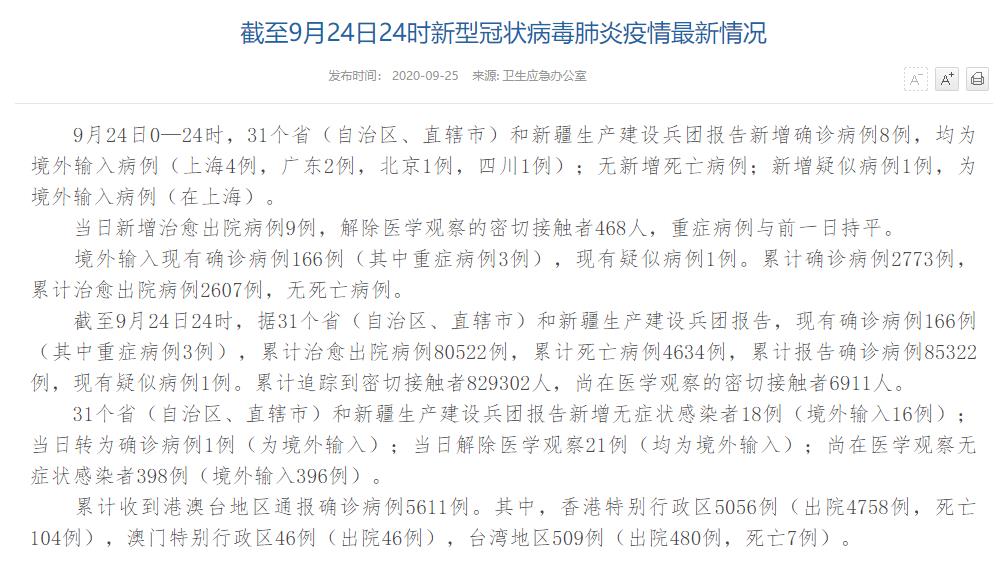 人民網(wǎng)北京9月25日電(董童)國家衛(wèi)生健康委于今日在官網(wǎng)發(fā)布的《截至9月24日24時(shí)新型冠狀病毒肺炎疫情最新情況》(以下簡稱“情況”)顯示,9月24日0—24時(shí),31個(gè)省(自治區(qū)、直轄市)和新疆生產(chǎn)建設(shè)兵團(tuán)報(bào)告新增確診病例8例,均為境外輸入病例(上海4例,廣東2例,北京1例,四川1例);無新增死亡病例;新增疑似病例1例,為境外輸入病例(在上海)。當(dāng)日新增治愈出院病例9例,解除醫(yī)學(xué)觀察的密切接觸者468人,重癥病例與前一日持平。