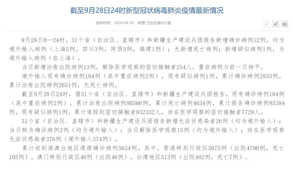 情況顯示,截至9月28日24時,據(jù)31個?。ㄗ灾螀^(qū)、直轄市)和新疆生產(chǎn)建設(shè)兵團報告,現(xiàn)有確診病例184例(其中重癥病例2例),累計治愈出院病例80566例,累計死亡病例4634例,累計報告確診病例85384例,現(xiàn)有疑似病例1例。累計追蹤到密切接觸者832332人,尚在醫(yī)學觀察的密切接觸者7729人。