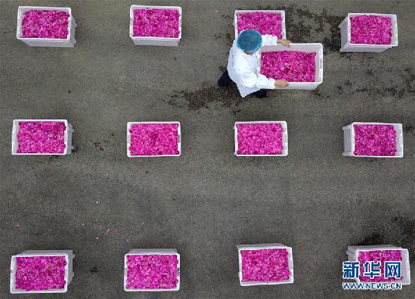 2018年4月21日,在貴州省鎮(zhèn)遠(yuǎn)縣青溪鎮(zhèn)一家以鮮花為原料釀酒的企業(yè),工人在搬運(yùn)玫瑰花(無人機(jī)拍攝)。新華社發(fā)(蔡興文 攝)