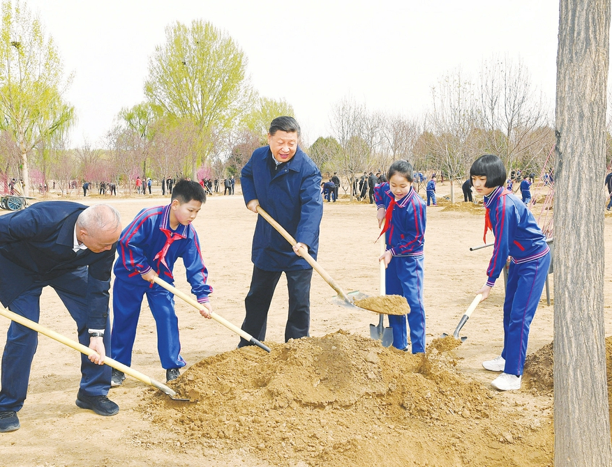 油松、國槐、側(cè)柏、玉蘭、紅瑞木、碧桃……習(xí)近平接連種下7棵樹苗。他一邊勞動(dòng),一邊向身邊的少先隊(duì)員詢問學(xué)習(xí)生活和體育鍛煉情況,叮囑他們從小養(yǎng)成愛護(hù)自然、保護(hù)環(huán)境的意識(shí),用自己的雙手把祖國建設(shè)得更加美麗,祝他們像小樹苗一樣茁壯成長(zhǎng)。