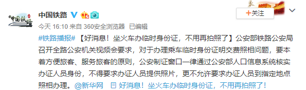 人民網(wǎng)北京5月8日電 據(jù)中國(guó)鐵路總公司官方微博消息,公安部鐵路公安局召開全路公安機(jī)關(guān)視頻會(huì)要求,對(duì)于辦理乘車臨時(shí)身份證明交費(fèi)照相問題,要本著方便旅客、服務(wù)旅客的原則,公安制證窗口一律通過公安部人口信息系統(tǒng)核實(shí)辦證人員身份,不得要求辦證人員提供照片,更不允許要求辦證人員到指定地點(diǎn)照相辦理。