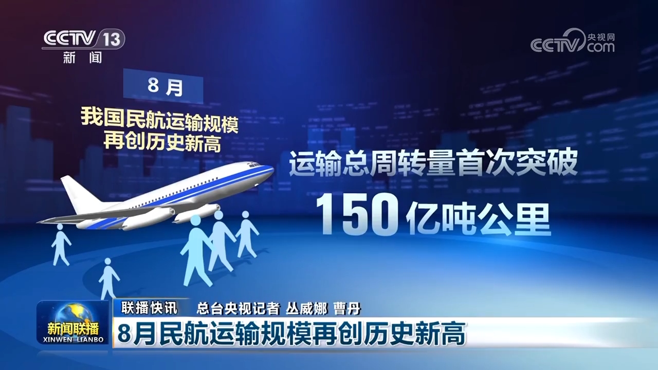 8月,我國(guó)民航運(yùn)輸規(guī)模再創(chuàng)歷史新高,運(yùn)輸總周轉(zhuǎn)量首次突破150億噸公里,旅客運(yùn)輸量達(dá)7536.4萬人次,國(guó)際航線旅客運(yùn)輸量同比增長(zhǎng)15.3%。