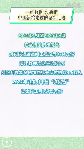 一組數(shù)據(jù),勾勒出中國法治建設的堅實足跡:2021年1月至2025年9月,檢察機關依法提出刑罰執(zhí)行監(jiān)督糾正意見等97.1萬件;清理收押難、送監(jiān)難問題,糾正判處監(jiān)禁刑罰罪犯未交付執(zhí)行9.6萬人;2022年以來對不當“減假暫”提出糾正意見7.5萬件……