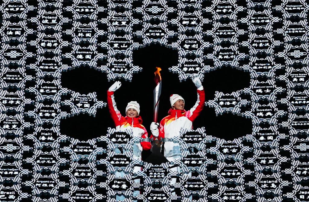 2022年2月4日晚,第二十四屆冬季奧林匹克運(yùn)動會開幕式在北京國家體育場舉行。這是最后一棒火炬手迪妮格爾·衣拉木江和趙嘉文(右)。新華社記者 曹燦 攝