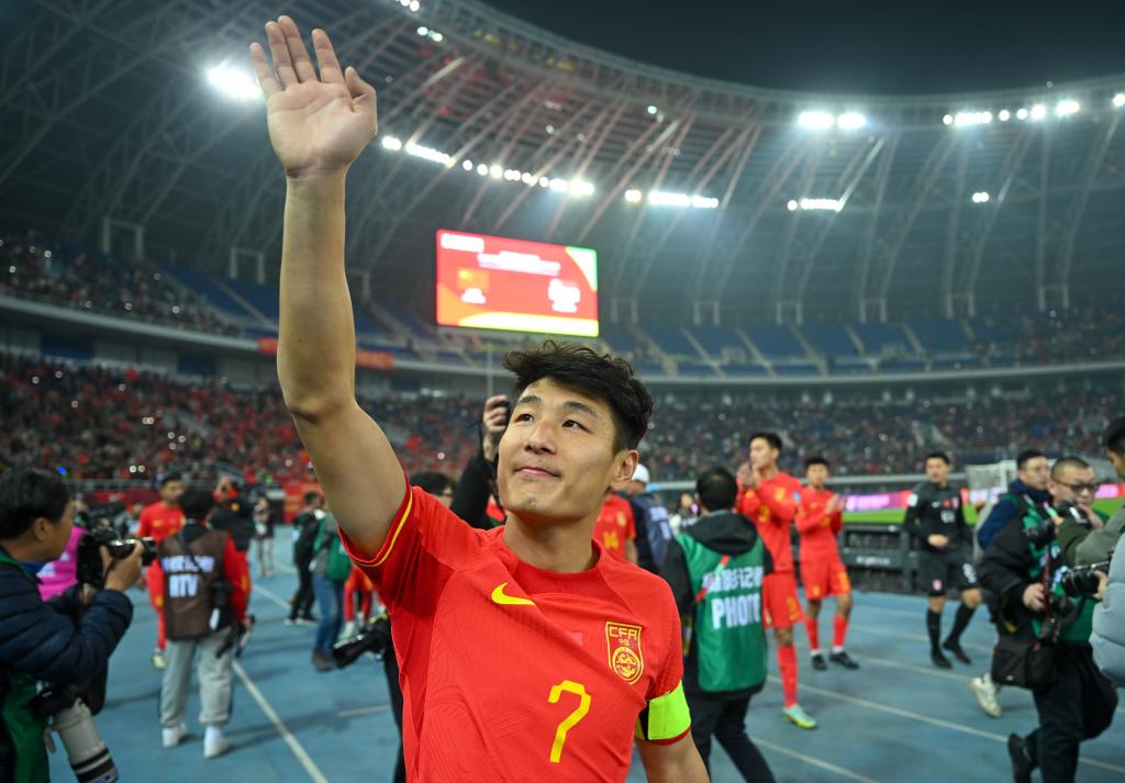 3月26日,中國隊(duì)球員武磊在比賽后向球迷致意。當(dāng)日,在天津舉行的2026年國際足聯(lián)世界杯亞洲區(qū)預(yù)選賽36強(qiáng)賽C組比賽中,中國隊(duì)主場(chǎng)4比1戰(zhàn)勝新加坡隊(duì)。新華社記者 孫凡越 攝