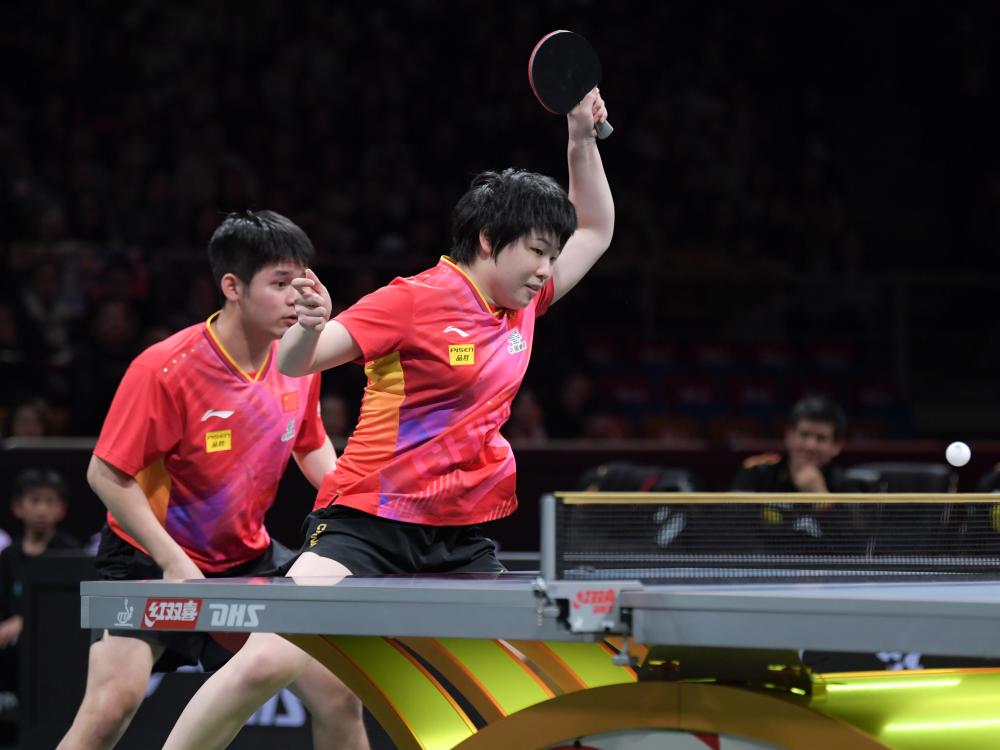 12月4日,中國隊組合林詩棟/蒯曼(右)在混雙比賽中。新華社記者 王曦 攝