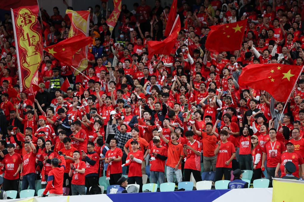 11月19日,球迷慶祝中國隊進球。當(dāng)日,在福建廈門舉行的2026美加墨世界杯亞洲區(qū)預(yù)選賽18強賽第六輪比賽中,中國隊主場對陣日本隊。新華社記者 胡星宇 攝